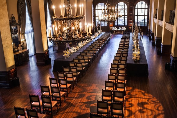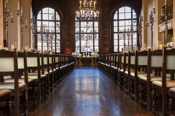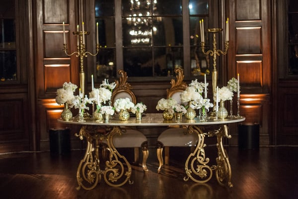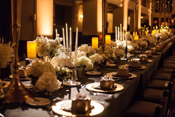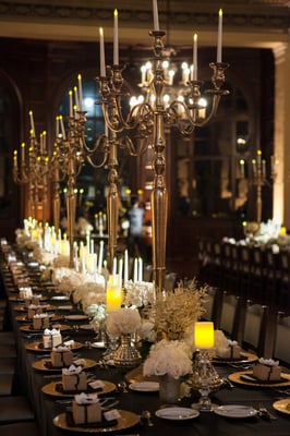 - Long banquet style table-scapes with dramatic gold candelabras and heavy runner of white floral pieces